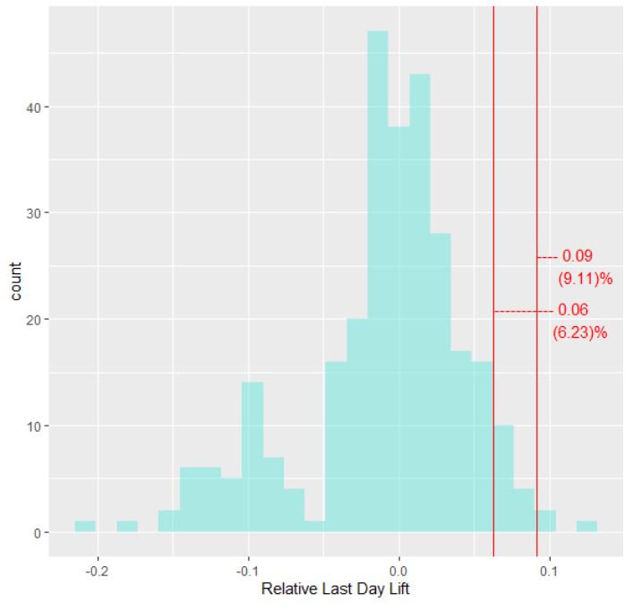This analysis sought to evaluate the effectiveness of a pop-up message reminding players of the last day of sale for offers in a free-to-play mobile game for increasing revenue. A pop-up message was delivered to players for every offer the first time they open the game during its sale duration. However, for this task an additional, second message was delivered to players on the last-day of sale to induce a sense of urgency. The pop-up stressed the limited time available to purchase the offer. Two offers were selected to have this additional feature. The effectiveness was then evaluated by calculating the last day “lift”, that is, the difference between the second-to-last and last day of sale relative to its total revenue, to give an idea of how big the spike (or lack thereof) was. The above graph shows the distribution of this relative last-day lift for offers sold during a span of about a year with the two test bundles marked by a red line. We can see visually that they are to the far right of the distribution, indicating a higher last day lift, 6.23% and 9.11% respectively. The mean of the test offers (M = 0.07 or 7%) was also compared statistically to the mean of all other offers (M = -0.01 or -1%) which did not have the last-day message. This difference was statistically significant (p = 0.02). These results suggested that having a second message advertising the last-day of sale for these offers was likely beneficial in increasing the size of the last-day revenue spike.